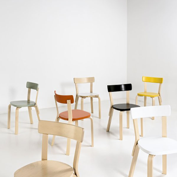 Chair 69 firmata da Alvar Aalto per Artek è una sedia realizzata con gambe, bordino sedile e schienale in massello di betulla. Disponibile in diverse finiture.