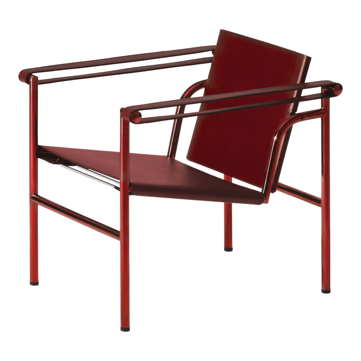 La poltroncina 1 Fauteuil dossier basculant, 60 è disegnata da Le Corbusier, Pierre Jeanneret e Charlotte Perriand per Cassina con telaio in tubolare d’acciaio con finitura rosso, blu, verde lucido, molle in acciaio nichelato per fissaggio e ancoraggio rivestimento, seduta in Cuoio Plus autoportante ton-sur-ton.
